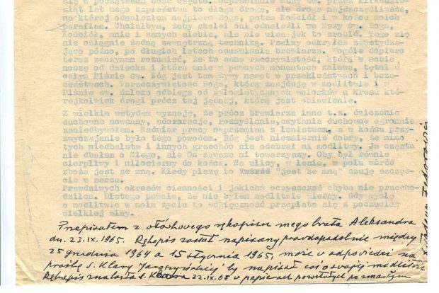 ks. Tadeusz Fedorowicz: Przepisałem z ołówkowego rękopisu mojego brata Aleksandra dnia 23 IX 1965. Rękopis został napisany prawdopodobnie między 25 grudnia 1964 a 15 stycznia 1965, może w odpowiedzi na prośbę s. Klary Jaroszyńskiej, by napisał coś o swojej modlitwie. Rękopis znalazła s. Klara 22 IX 1965 w papierach pozostałych po zmarłym.